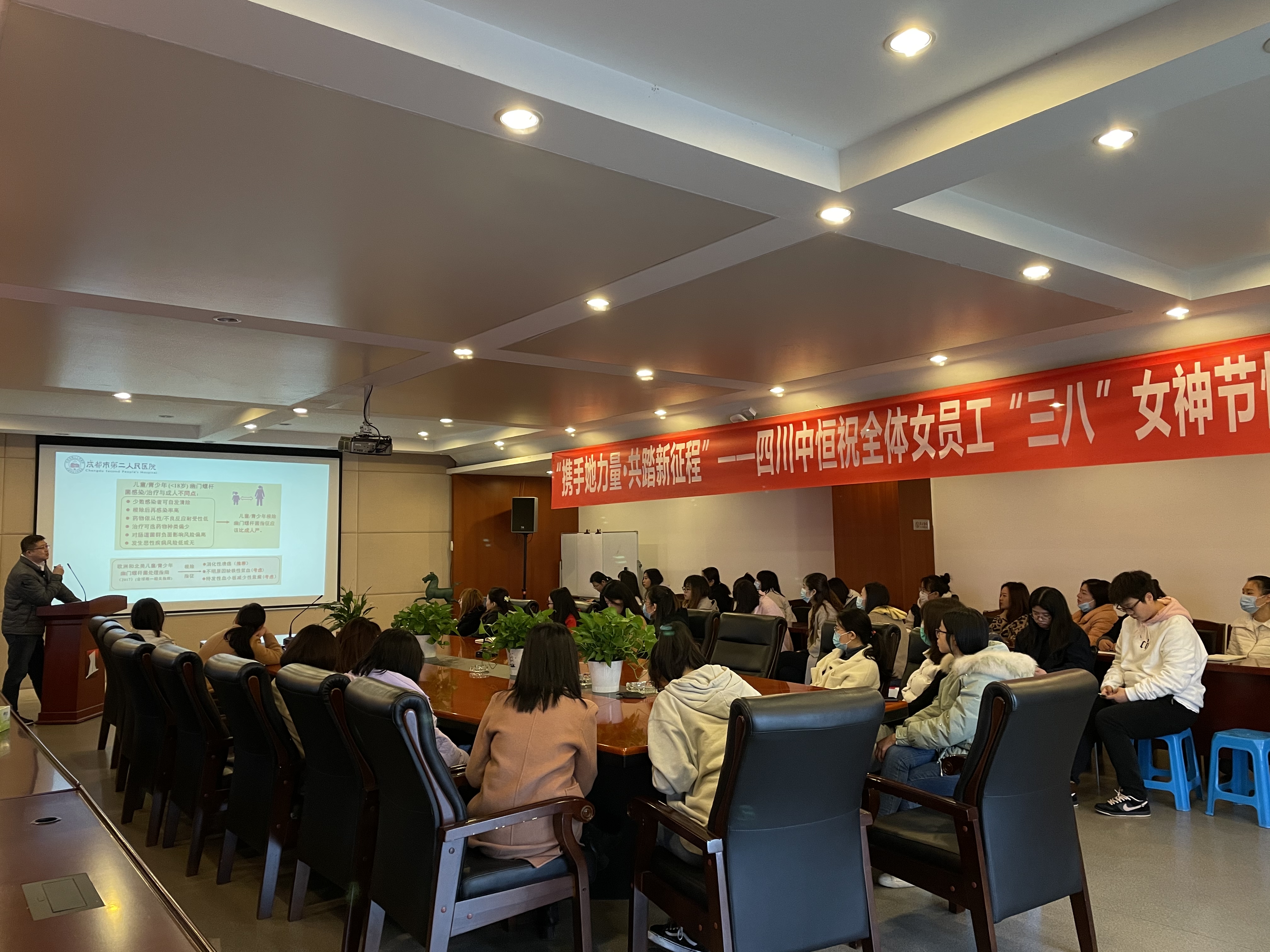 公司荣誉董事长、监事会主席熊总代表公司及全体男士为女职工们献上节日的问候,开展了幽门螺杆菌方面的健康知识讲座、微景观盆景DIY、鲜花献礼等一系列活动,在让女职工们感受浓浓的节日氛围,同时传达公司对女员工的深切关怀与美好祝愿。